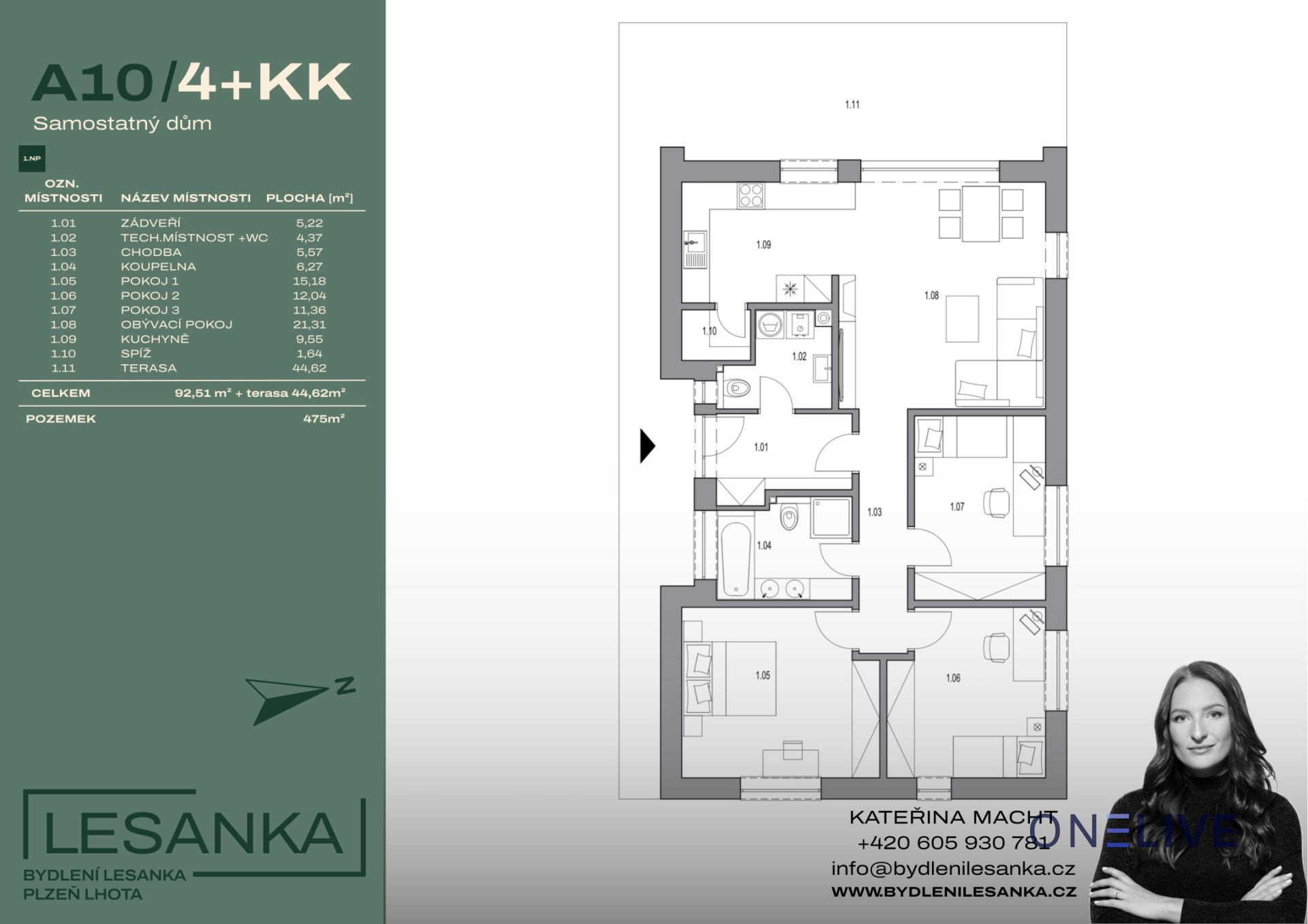 V rámci první etapy projektu bydlení Lesanka nabízíme samostatný rodinný dům o dispozici 4+kk, umístěný v nově vznikající lokalitě Plzeň – Lhota, na začátku obce. Lokalita se nachází mimo hlavní komunikaci a nabízí výjimečné spojení klidného bydlení s výbornou dostupností do Plzně i na nájezd na dálnici D5. Velkou výhodou je také bezprostřední blízkost přírody a lesa, které jsou přirozenou součástí každodenního života obyvatel v této lokalitě. Dům je součástí moderní zástavby rodinných domů, která propojuje les, klid a soukromí s velmi dobrou dostupností do centra Plzně. Obec Plzeň – Lhota disponuje základní občanskou vybaveností, mateřskou školou, mateřským centrem a možnostmi sportovních i volnočasových aktivit přímo v obci. Nabízené domy mají podlahovou plochu 92,51 m², terasu o velikosti 44,62 m² a pozemky o výměře 474–475 m². Dispozičně jsou řešeny prostorným obývacím prostorem s kuchyňským koutem a přímým vstupem na terasu, přičemž součástí kuchyňského koutu je také samostatná spíž sloužící jako praktický úložný prostor pro potraviny. Dále dům disponuje ložnicí a dvěma dětskými pokoji. Součástí domu je koupelna s vanou, sprchovým koutem, dvojumyvadlem a toaletou. Dále samostatné WC s umývátkem a technickým zázemím Všechny domy v projektu budou realizovány ve vysokém standardu provedení s využitím kvalitních materiálů a moderních technologií. Zájemci mohou vybírat ze tří variant provedení GOLD, SILVER a SHELL & CORE, které jsou detailně popsány ve standardech a na webových stránkách projektu. Součástí ceny je zahradní domek o velikosti 6 × 3 m, oplocení pozemku, venkovní dlažby a dvě parkovací stání před domem. Zdrojem vytápění a ohřevu teplé vody je tepelné čerpadlo, rozvod tepla je řešen podlahovým vytápěním. V současné době probíhají práce na infrastruktuře. Zahájení výstavby je plánováno na 2. čtvrtletí 2026, dokončení prvních domů na 4. čtvrtletí 2027. Pro více informací, cenovou nabídku a dostupnost konkrétního domu mě neváhejte kontaktovat. Ráda vám projekt bydlení Lesanka osobně představím. * Uvedená cena domu odpovídá provedení ve standardu SILVER.
