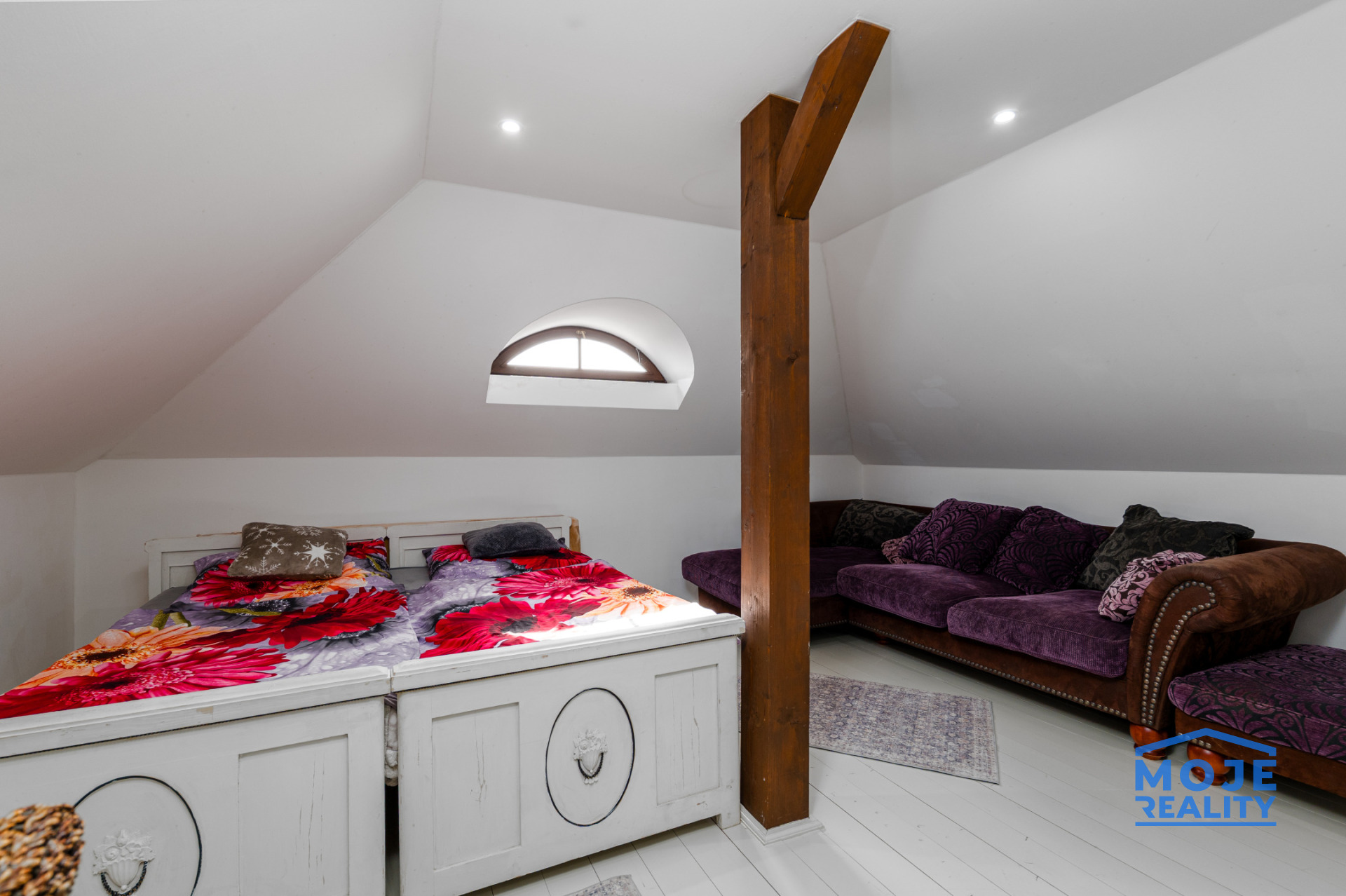 renovované dřevěné podlahy, nová okna (trojskla), kompletní renovace dřevěných trámů, koupelen i zázemí